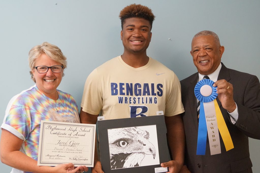 BLYTHEWOOD – Blythewood High School junior Jared Gary has been recognized as the Principal’s Purchase award winner for his pen and ink drawing. Gary, center, is pictured with his 2D Art teacher Mrs. Margaret Roberson, left, and BHS Principal Bobby Cunningham.
