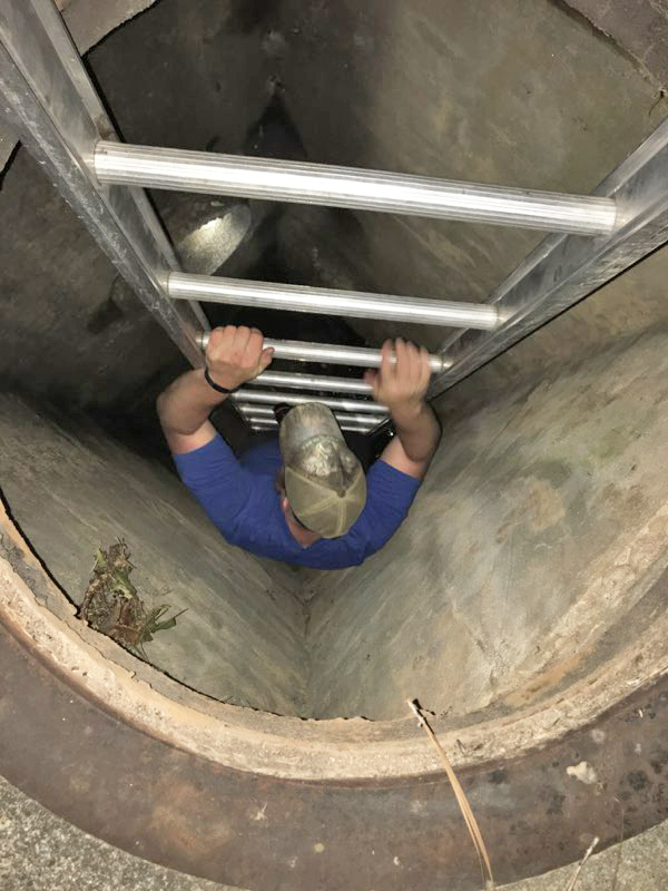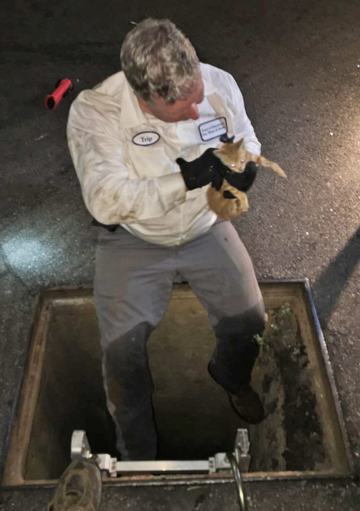 WINNSBORO – An evening phone call from a concerned CVS customer about hearing a cat down the parking lot storm drain turned into a four-hour, multi-department rescue effort. Fairfield County fireman Jay Joyner lowered the truck’s ladder into the storm drain for Trip Peak, Town of Winnsboro Director of Gas, Water and Sewer, and Mikey Bunting, Gas, Water and Sewer Foreman. The two crawled approximately 150 feet through the storm drains before locating the trapped kitten, which is now at the Fairfield County Animal Shelter awaiting adoption.