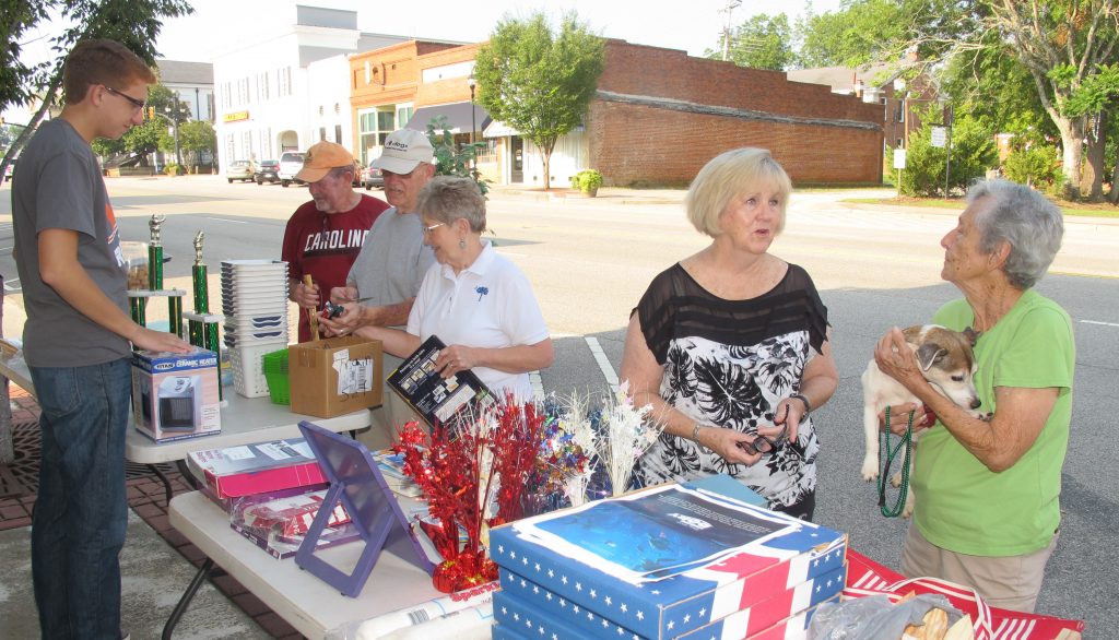 WINNSBORO – The Fairfield County Chamber of Commerce held a moving sale last Saturday in preparation of their move back to the Town Clock this week. Dillon Pullen, left, helped shoppers Tommy Richardson and Robert and Bobbie Pemberton while Betty Gutschlag, right, visited with Chamber Director Terrie Vickers. Following Saturday’s sale, the Chamber relocated to the Town Clock on Wednesday.