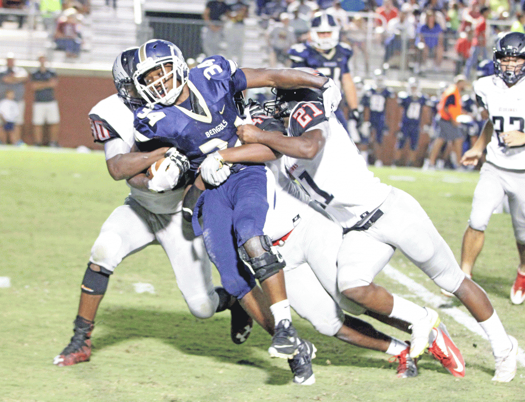 Jaylon Boyd (34) carries the weight of three Redhawk defenders as he grinds out every yard. | Photos: Leroy Howard