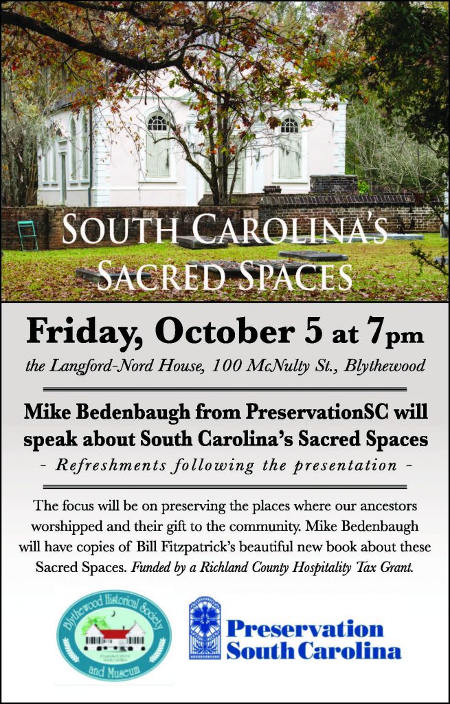 On Oct. 5 at 7 p.m., Mike Bedenbaugh, executive director of Preservation South Carolina, will be at the Langford-Nord House to talk about South Carolina’s sacred spaces and the importance of saving them. He will be signing copies of the book.