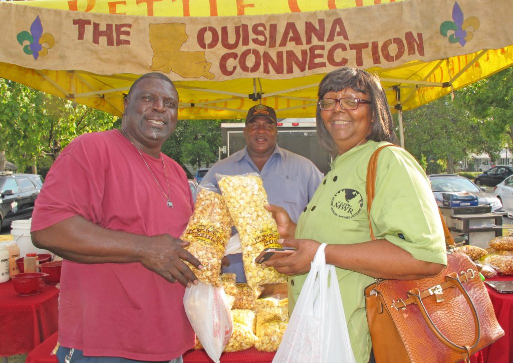 David and Sandra Carmichael purchase kettle corn from Irvine Brazell.