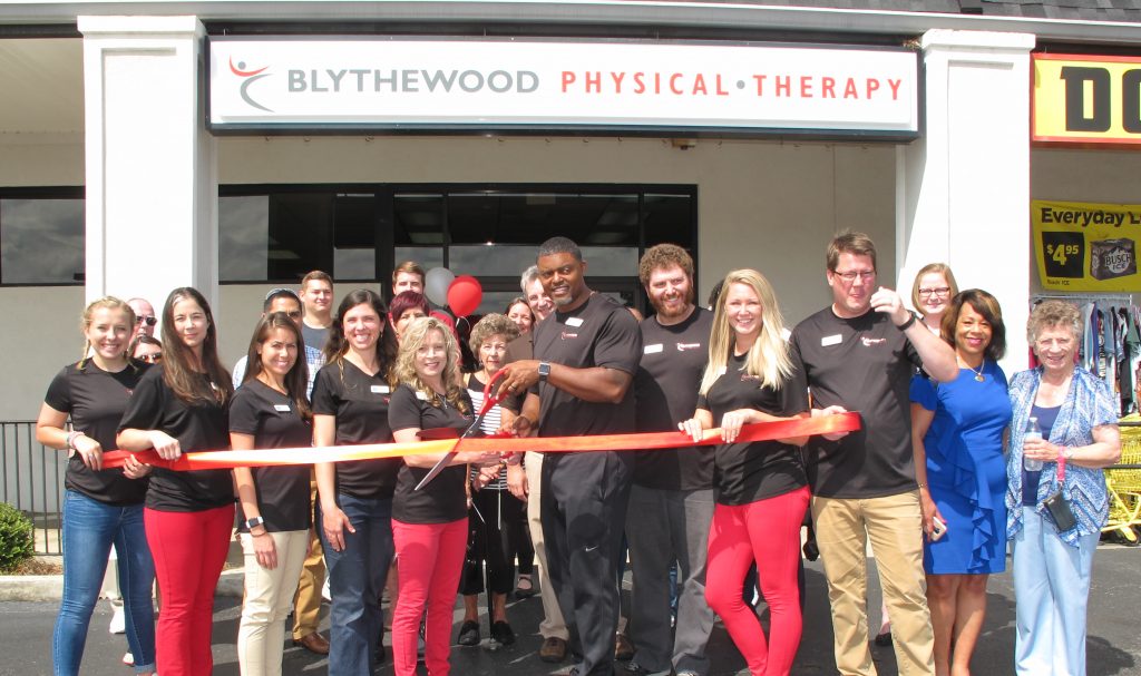 - Blythewood Physical Therapy employees Brooke Green, left, Joye Mizell, Alex Filler, Blythewood Physical Therapy Supervisor Brian Gray, Pat Graham, Julie Bower, Liz Navarrete and Anna Clark will be on hand to invite visitors to enjoy an anniversary celebration on Friday, July 12 from 12 – 1.