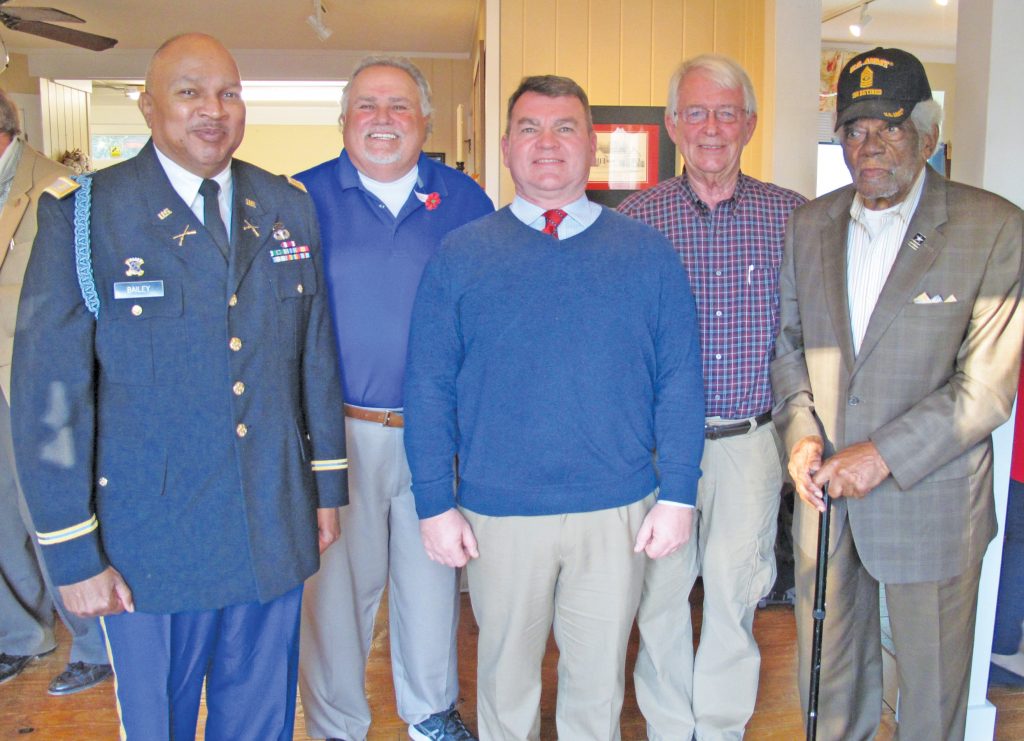 Blythewood resident James Lecher, center, recounted his combat experiences as an Army Ranger during the Blythewood Historical Society’s Veterans’ Day event. Also participating in the program are, from left, former mayor, Lt. Col. (Ret.) Keith Bailey, Mayor J. Michael Ross, Lecher, Jim McLean and WWII veteran Moses Kelly. | Barbara Ball
