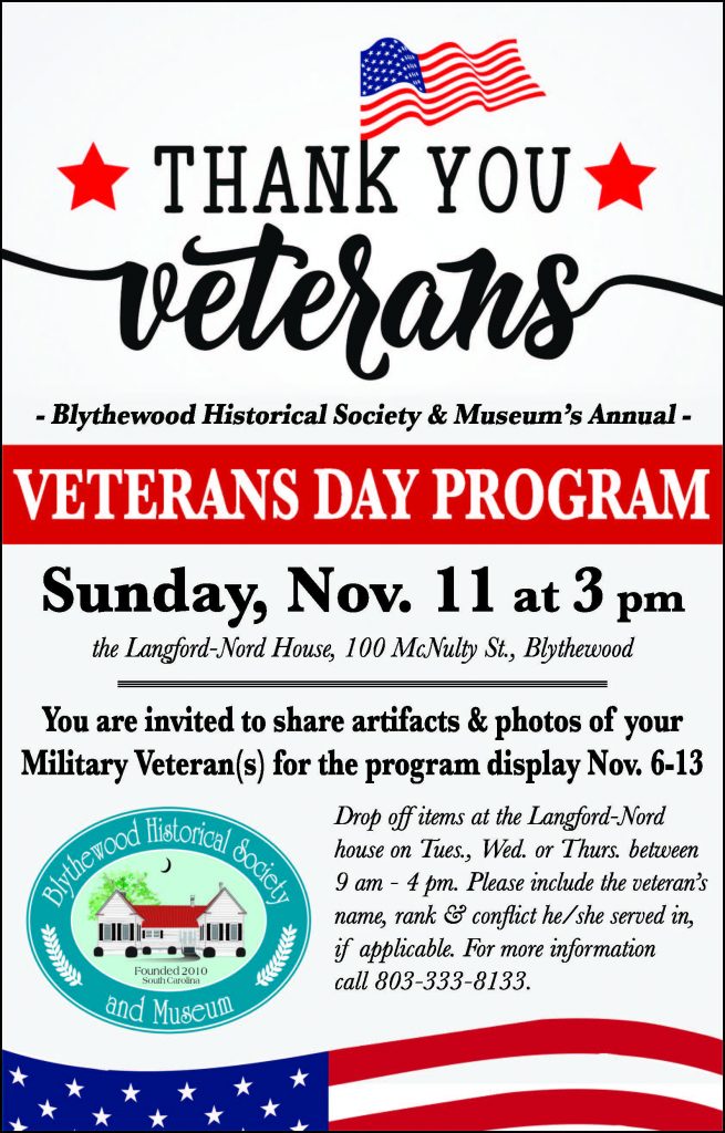 BLYTHEWOOD – The Blythewood Historical Society and Museum will host the community for a Veterans Day Celebration at the Langford-Nord House on Sunday, Nov. 11.