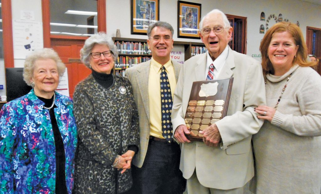 Dr. Clyde McCants, center, receives the Lifetime Membership Award with Hannah Phillips, former Library Director Sara McMaster, Library Director Eric Robinson, and FOL President Michelle Taylor.