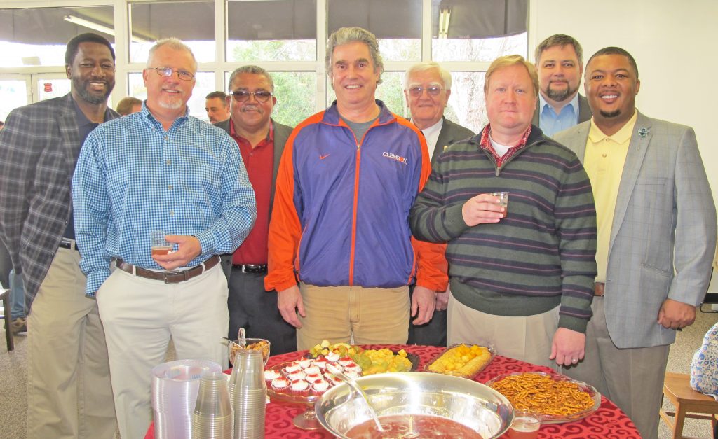 Superintendent Dr. J.R. Green, Town Councilman Dan Martin, County Councilman Moses Bell, former County Councilman Dan Ruff, Board Chair Paul Dove, County Administrator Jason Taylor, Chamber Director Chris Stephenson and County Councilman Neil Robinson.