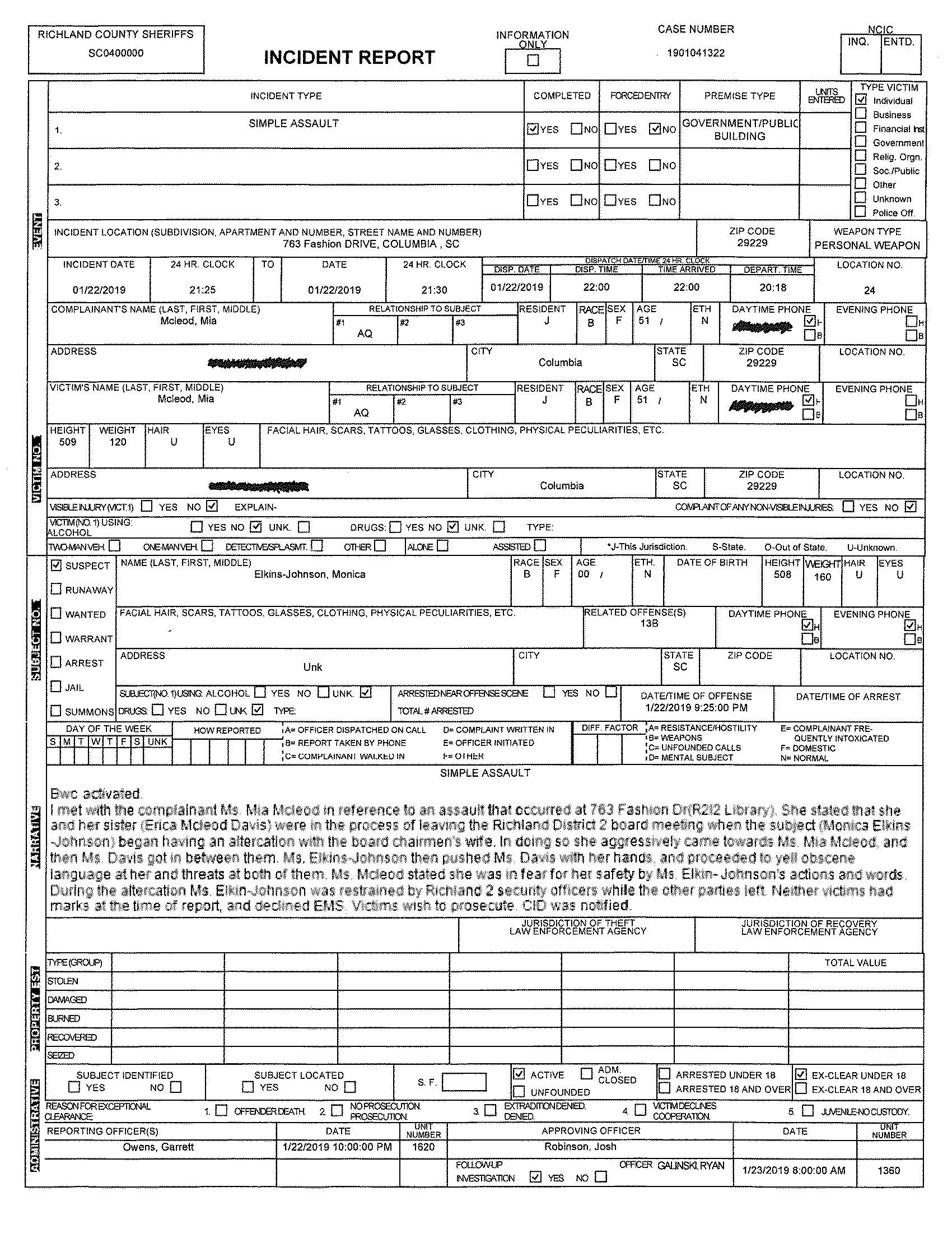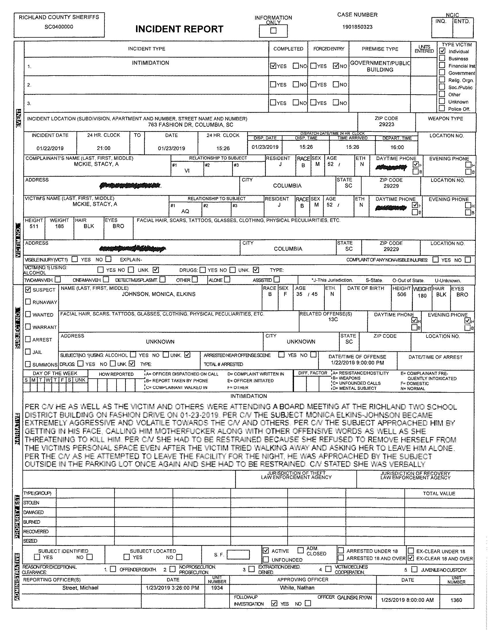 Although the police report contained significant redactions, Richland Two board member Monica Elkins-Johnson is named in the restraining order petition.