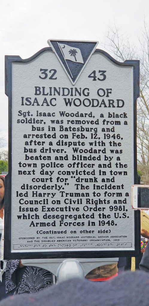 After recounting the events surrounding Woodard’s brutal beating, Gaddy said, “It is with great honor that we are proud to see this historical marker be placed in Batesburg-Leesville to honor and acknowledge his life and service.”