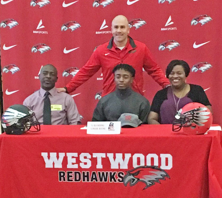 BLYTHEWOOD – Westwood defensive back TJ Blanding, seated center, signed last week with Lenoir Rhyne University. Blanding finished his senior season with 50 tackles, one offensive touchdown, and two punt returns for touchdowns. Pictured with Blanding are Ted Blanding Sr., seated left, Head Coach Dustin Curtis, standing, and Stephanie Blanding, seated right.