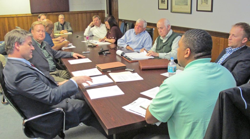 The new board of the county and town’s joint water/sewer authority met during an organizational meeting to elect officers, discuss incorporation and receive an engineering update. Attending the meeting were C. D. Rhodes, III, clockwise left, attorney with Pope Flynn, who represents the new joint water/sewer authority board; County Administrator Jason Taylor; Deputy County Administrator Davis Anderson; Winnsboro Town Attorney John Fantry; County Economic Development Director Ty Davenport, County Clerk Patti Locklair Davis; Mayor Roger Gaddy; Town Manager Don Wood; Fairfield County resident and engineer Kyle T. Crager, senior project manager of water/wastewater operations for Michel Baker International and County Council Chairman Neal Robinson.