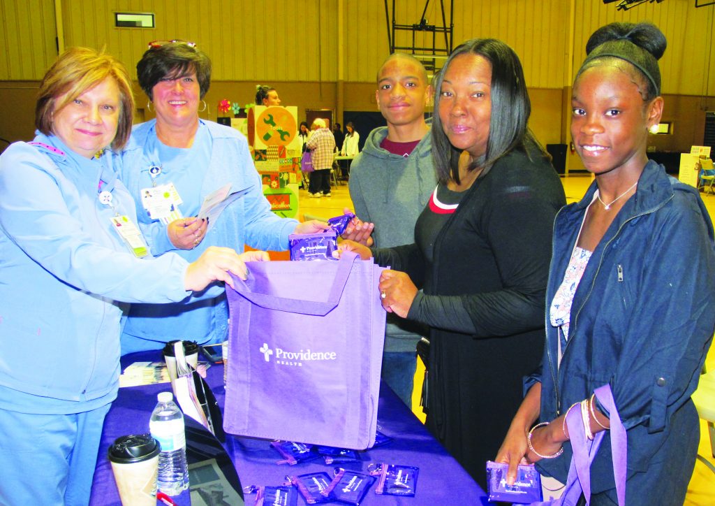 Representing Providence Health’s new ER facility in Winnsboro were, from left: registered nurses Arlene Vance and Robin Gilbert, who are shown above providing information and mini first aid kits to Jarvis Ballinger, Trista Davis and Saya Lyles. Doctors, nurses and other health care personnel were on hand to take blood pressure, conduct other health screenings and dispense nutritional and dietary advice.
