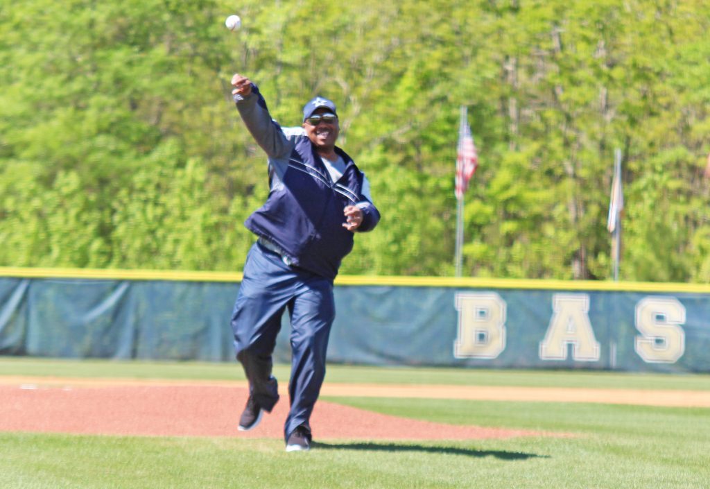 Let The Games Begin – Blythewood Town Councilman Larry Griffin threw out the ceremonial first pitch of the South Carolina Diamond Invitational at BHS on Wednesday. | Martha Ladd