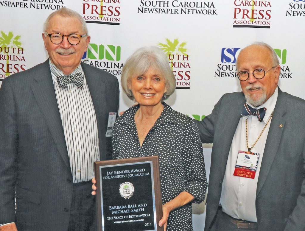 COLUMBIA – The 7th annual Jay Bender Award for Assertive Journalism was presented to The Voice’s publisher, Barbara Ball, and reporter Michael Smith at the South Carolina Press Association’s annual meeting in Columbia on April 6. This is the second year in a row that the newspaper has received the honor.