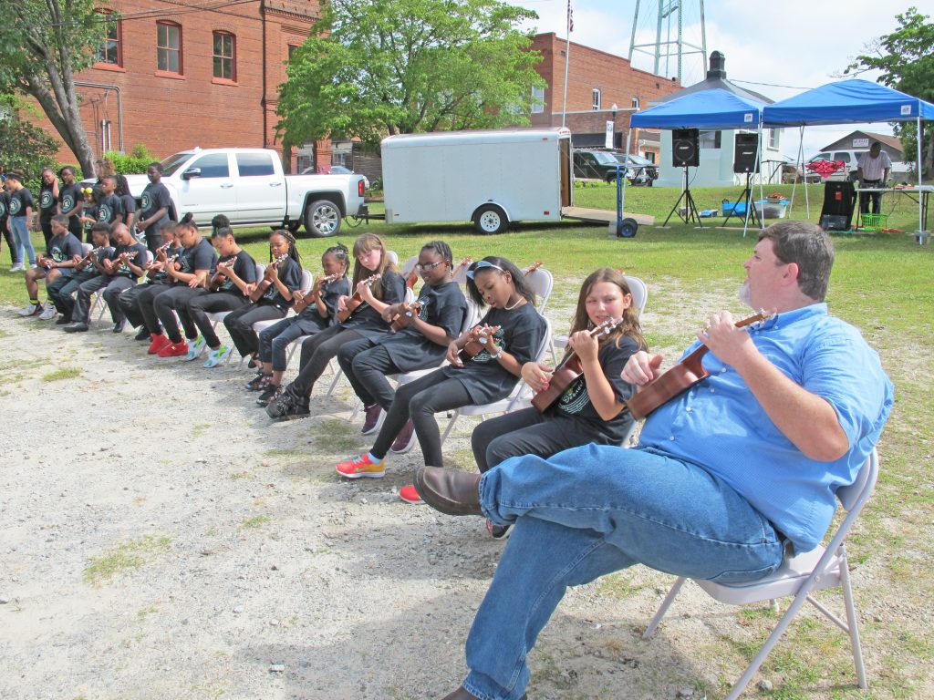 Mayor Cookendorfer joins the Geiger Elementary ukulele band.