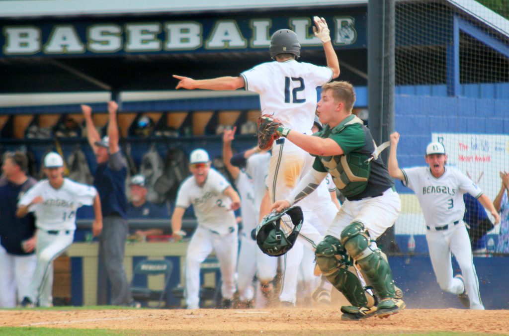 Michael Gregory (12) scores from Zach Bailes’ walk-off single to give the Bengals the 2-1 win in the ninth. | Photos: Martha Ladd