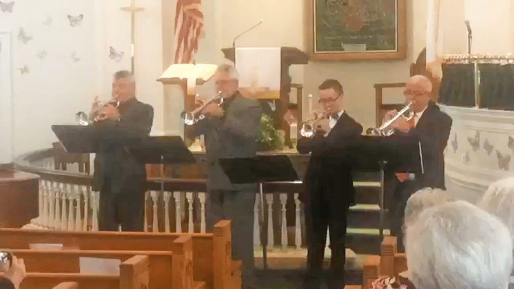 WINNSBORO – Aaron and Harold Frish and George and Wayne Binder performed a trumpet arrangement for the Winnsboro Music Study Club at Winnsboro First UMC Thursday, May 9. Wanda Neese was at the piano for the half-hour of horn music. Lunch was served to those attending following the performance. Aaron, second from right, is a fourth generation trumpet player in the Binder/Frish family and was a quarter-finalist in the National Trumpet Competition and has received many other honors.