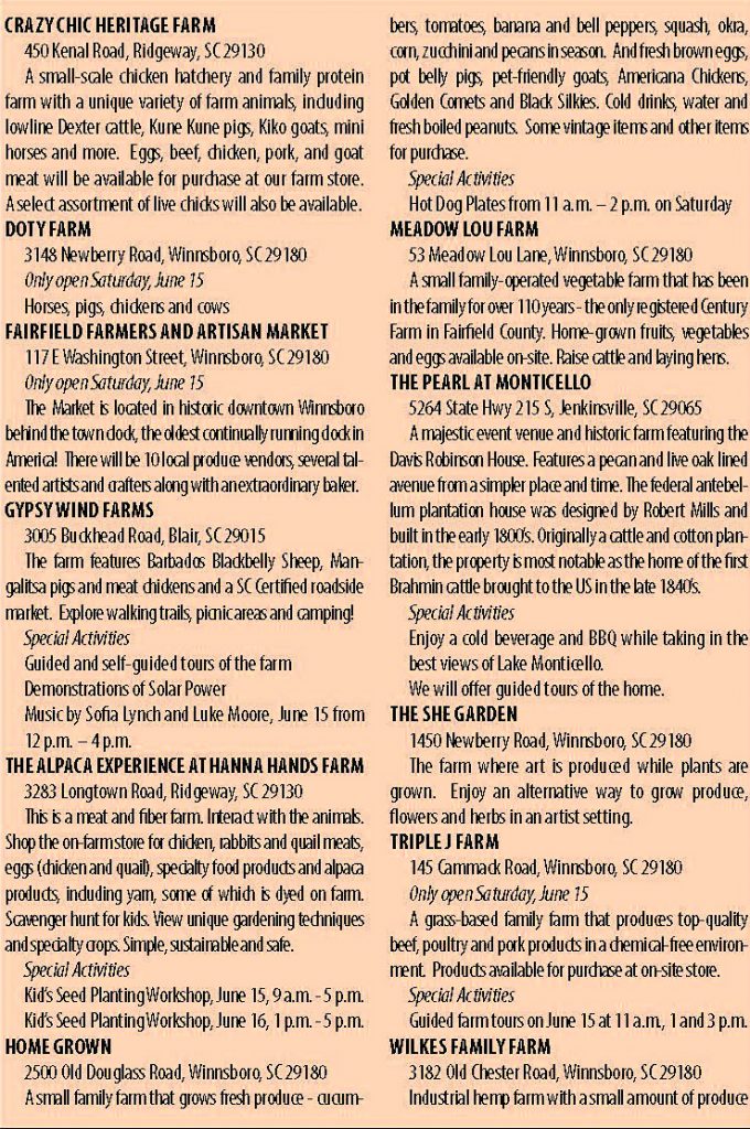 Then it’s off to the tour. Eleven farms throughout the county will be open for touring on Saturday, June 15, from 10 a.m. – 5 p.m. and Sunday, June 16, from 1 – 5 p.m. The tours are free.