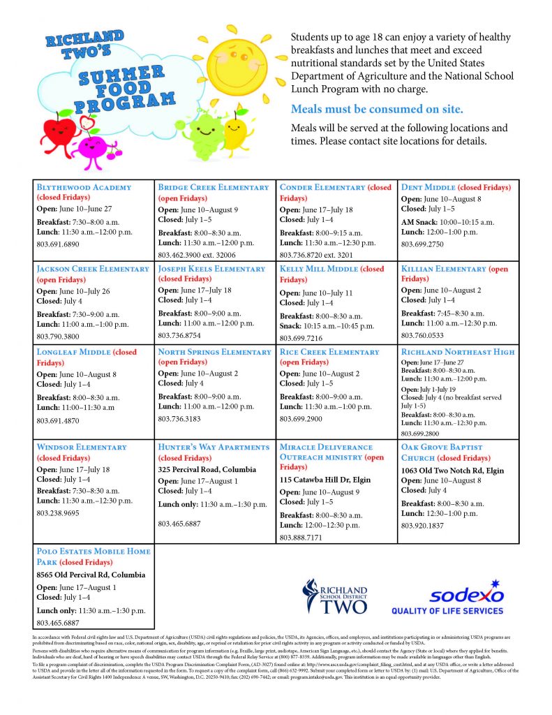 BLYTHEWOOD — Richland School District Two Food Services, operated by Sodexo, will again serve free meals this summer. Meals, provided at a first come, first serve basis, will be provided to all children age 18 and under.