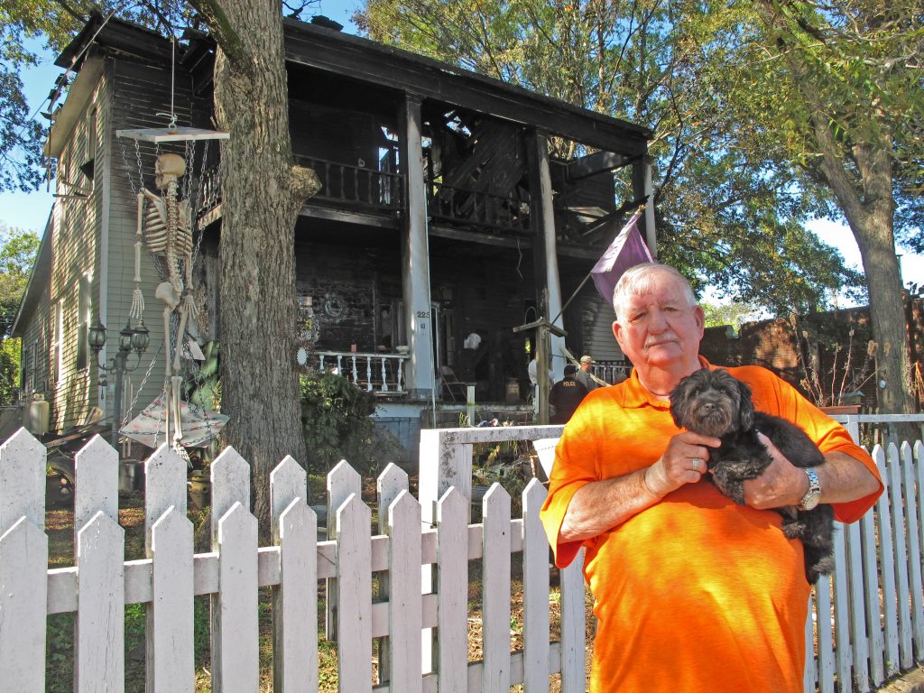 One of Mr. Sanders’ two dogs, an 11-year-old Pit Bull, was found dead in his igloo dog house on the front porch. A smaller dog survived the fire by crawling under a bed in an upstairs bedroom.