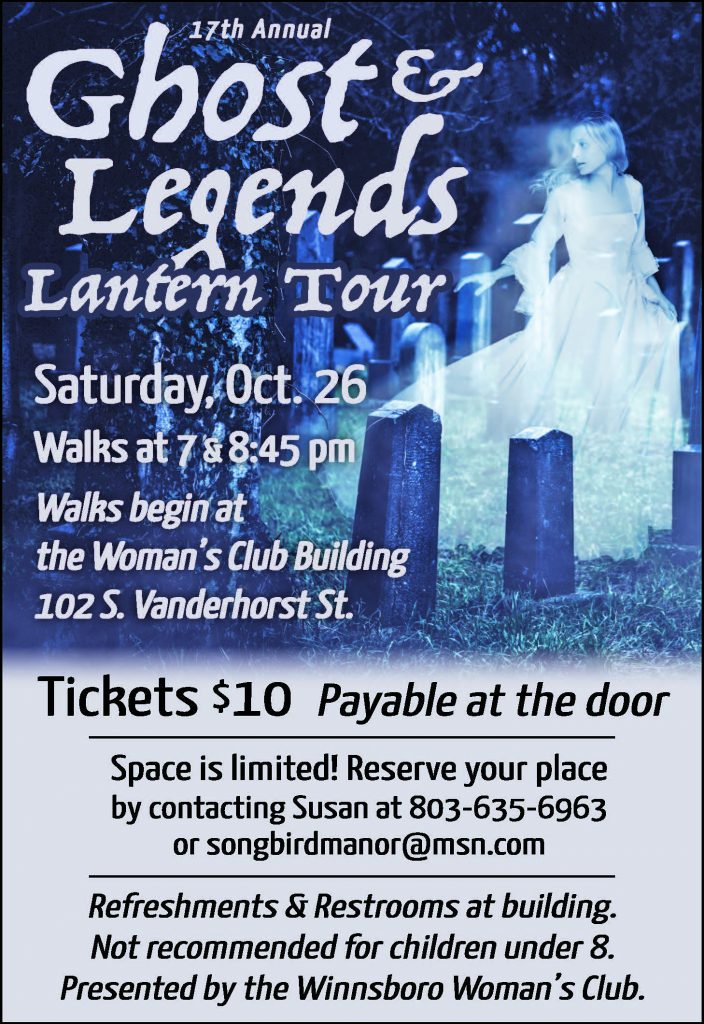 The Winnsboro Ghost & Lantern Tour, sponsored by the Winnsboro Woman’s Club, will host its annual guided walking tour of downtown Winnsboro’s historic district on Saturday, Oct. 26. The tour will take guests back to the early days of Winnsboro with tales of mysteries and more.