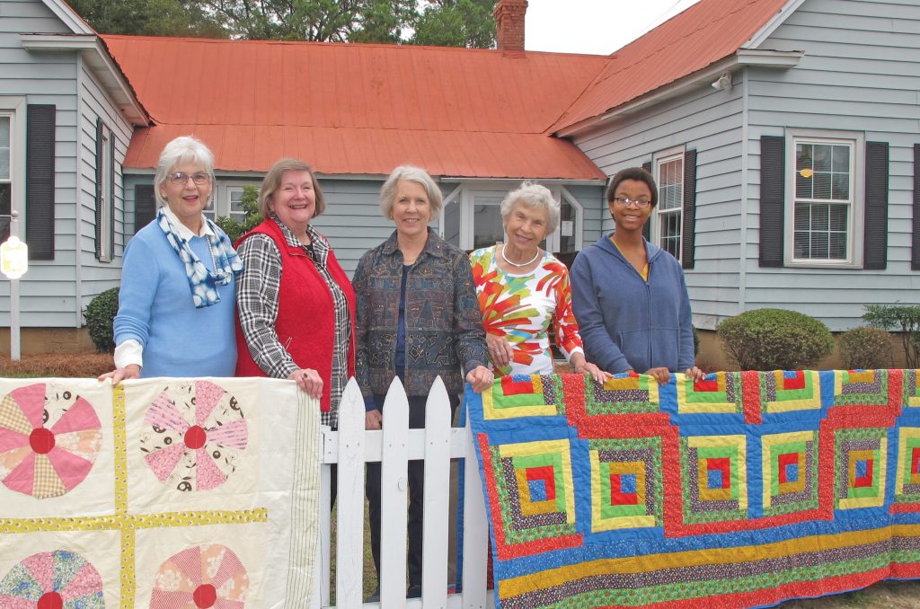 These members of the Society, Frankie McLean, Carolyn Lomas, Margaret Kelly, Jeanette Smith and Blythewood High School student volunteer Amya Brewer helped with the display of approximately 75 local and handcrafted quilts.