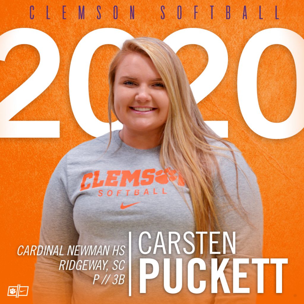 COLUMBIA – Ridgeway resident Carsten Puckett made history as a sophomore in 2018 when she became the first in-state commit for Clemson University’s new softball program. Surrounded by her family and Cardinal Newman teammates, Puckett made the deal official during National Signing Day on Nov. 14.