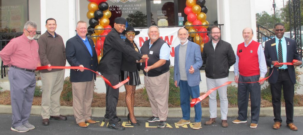 BLYTHEWOOD – Cutting the Ribbon for the new Scott Benny restaurant in McNulty Plaza are Owners Scott and Mimi and Blythewood Mayor J. Michael Ross. Also pictured are, from left: Chamber Interim Director Phil Frye, Town Administrator Brian Cook, mayor-elect Bryan Franklin, the owners, Ross, Councilman Malcolm Gordge, councilman-elect Donald Brock, Economic Development consultant Ed Parler and Byron Thomas.