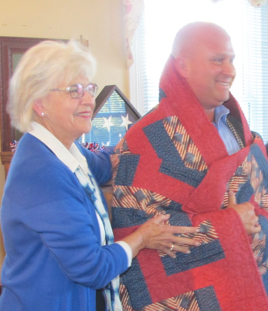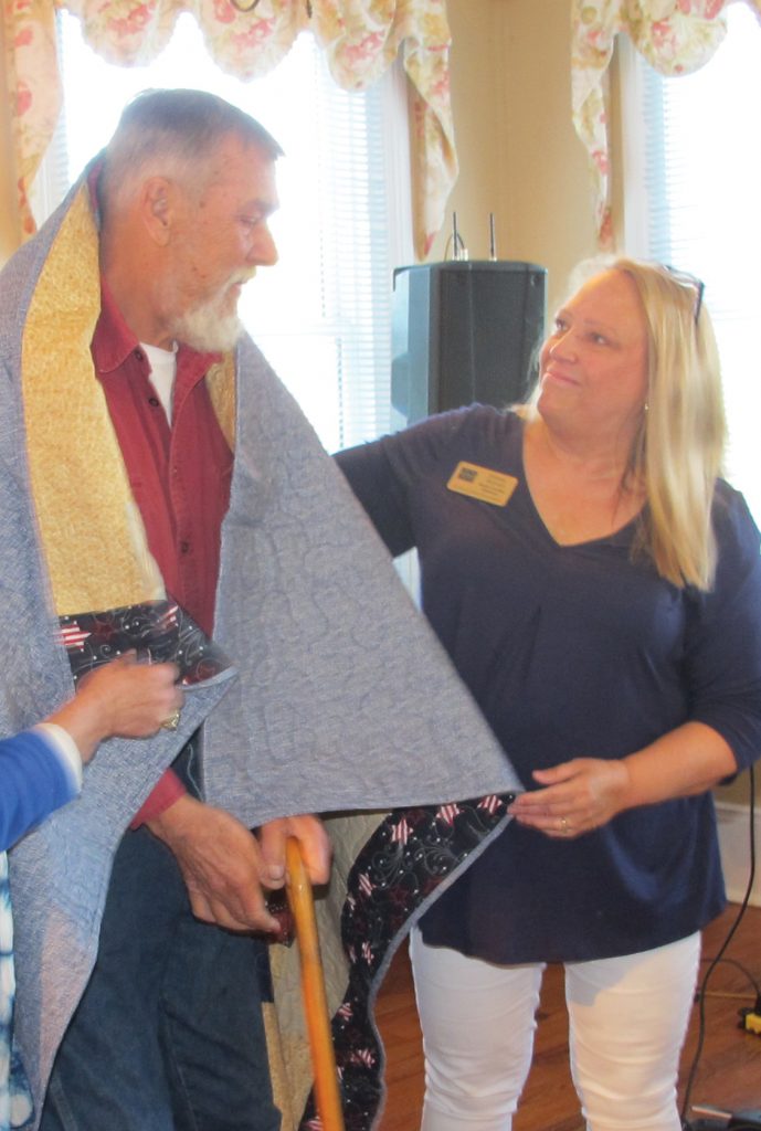 As Royson wrapped the hand-sewn quilt around the shoulders of Finley, noting that he had fought in Viet Nam, she whispered, ‘Welcome home.’ The emotional moment brought Finley and many in the audience to tears.