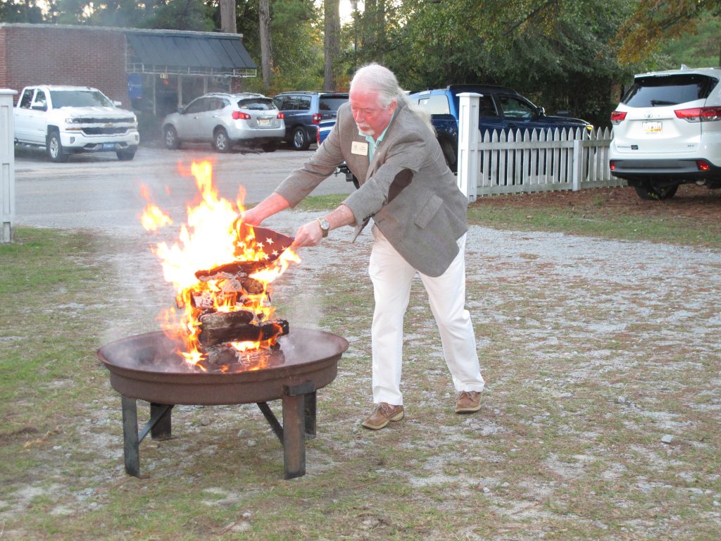 Guests moved outside, gathering on the lawn for a flag retirement ceremony led by Town Councilman and Navy veteran Eddie Baughman, who demonstrated the proper way to retire a flag in the flames.
