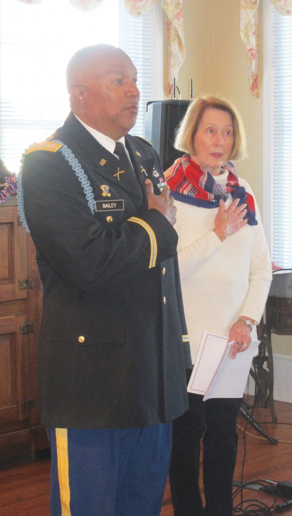 Inside, after welcoming remarks, former mayor, Army LTC Keith Bailey (ret.), led those attending in the Pledge of Allegiance. Vance and Jeannie Sharpe set the tone for the solemn program with patriotic songs.