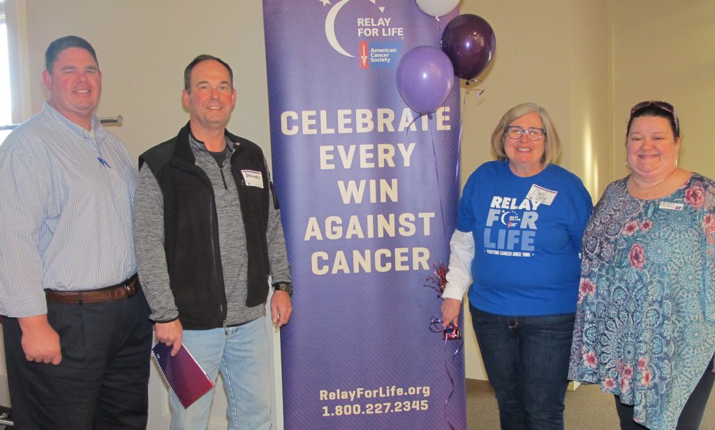 Kicking off the annual fundraiser are this year’s sponsors: Blythewood High School Principal Matt Sherman, left, and Westwood High School Principal Cheryl Guy, center right, standing with speaker Dennis Ballentine and Stephanie Reely, Southern Region Community Development Manager. The four met Sunday to organize and seek volunteers to help carry out the spring relay which honors survivors, remembers loved ones lost and raises money to further the American Cancer Society’s life-saving mission.