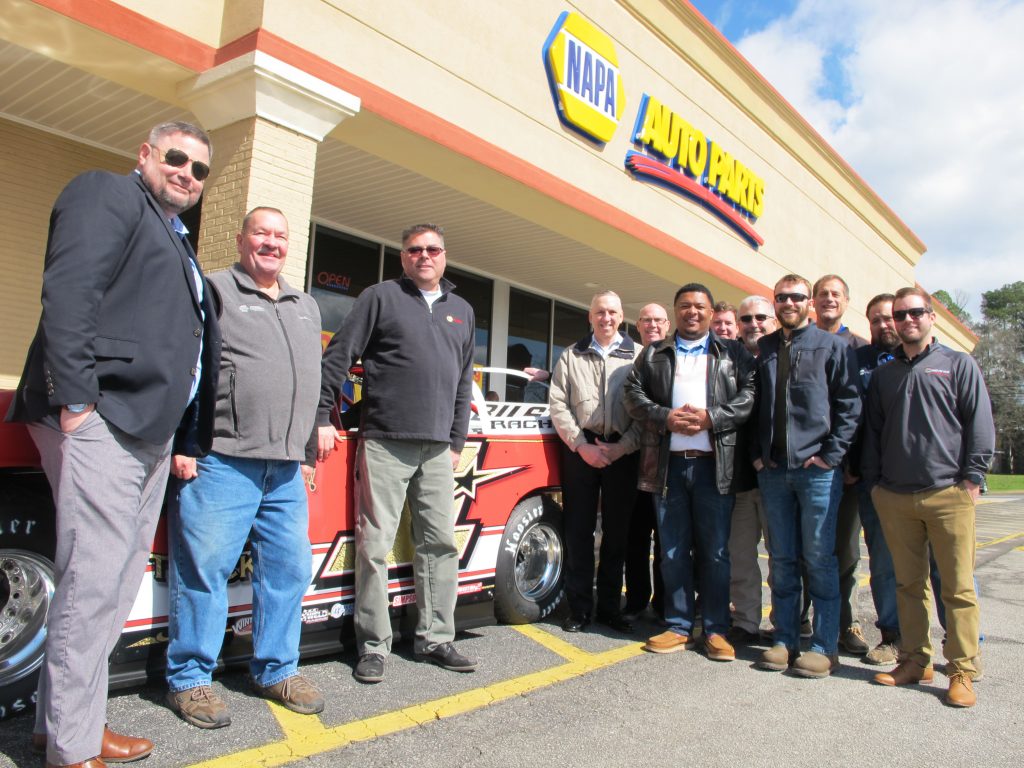 WINNSBORO – When Evan Dunbar (fourth from right) opened his new NAPA Auto Parts store in the Bi-Lo Shopping Center last week, there was lots of food and several customized vehicles were on display, including a late model dirt car that Dunbar’s store sponsors. Front row from left is Fairfield Chamber of Commerce President Gene Stevens; Roger Dunbar, underhood sales representative and Sean Middaugh, outside salesman; Mike Duffy, NAPA corporation representative; Fairfield County Council Chairman Neil Robinson and Dunbar.
