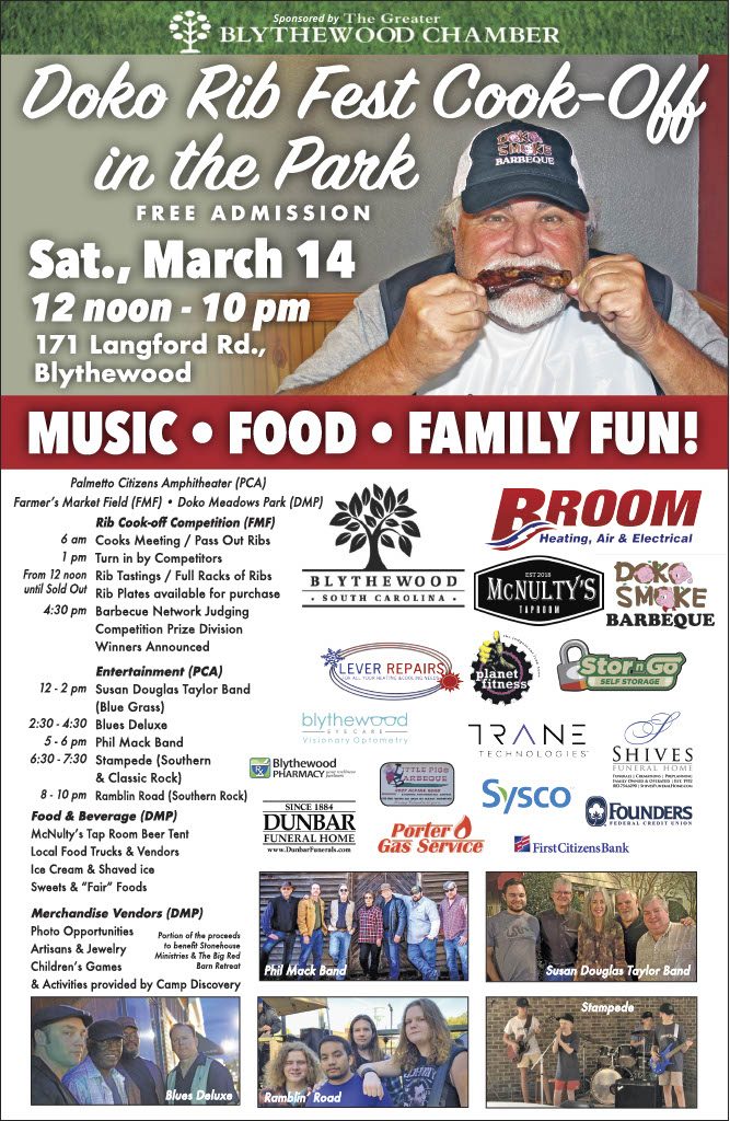 The Greater Blythewood Chamber of Commerce will host its first annual Doko Rib Fest Cook-Off in Doko Meadows Park on Saturday, March 14.