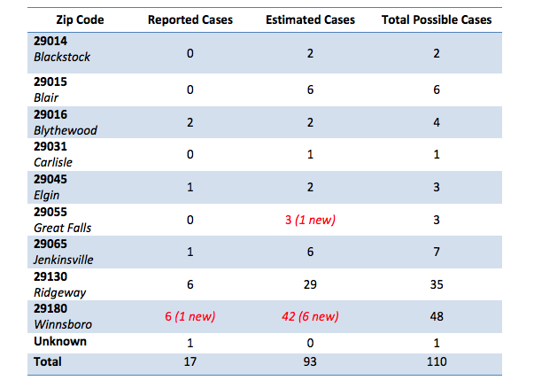 SCDHEC’s latest update for coronavirus case numbers in the following Blythewood and Fairfield County zip codes: