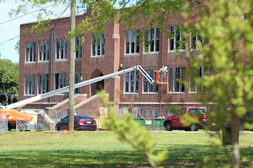 WINNSBORO – Construction work on the Mt. Zion Institute continues. The building is being renovated for use as a new county administration complex. The former gymnasium and auditorium have now been cleaned out and roof construction is underway.