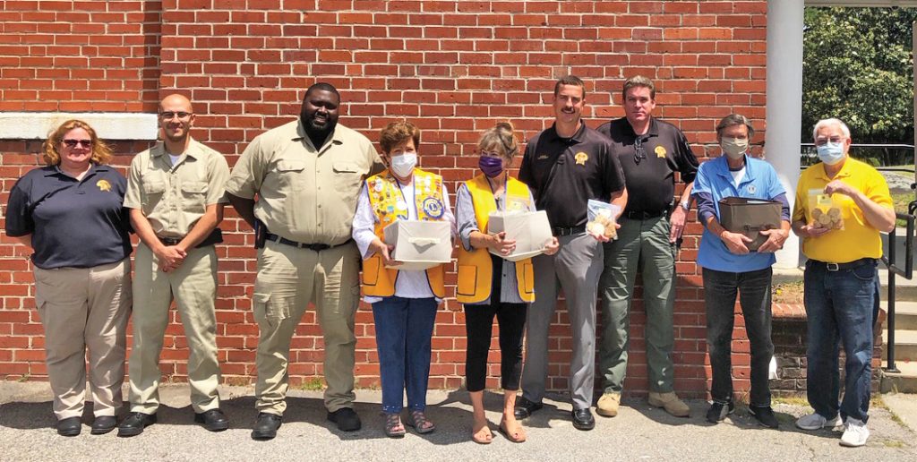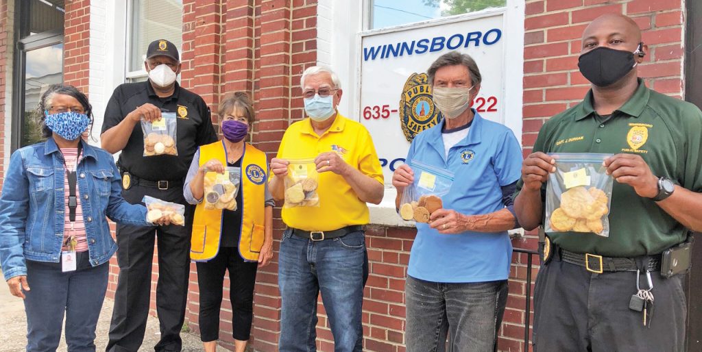 WINNSBORO – To show their appreciation to the Winnsboro Police Department, above, and the Fairfield County Sheriff’s Department for their vigilance during the Time of Corona, last week the Winnsboro Lions Club delivered 85 bags of home baked cookies to two law enforcement agencies.