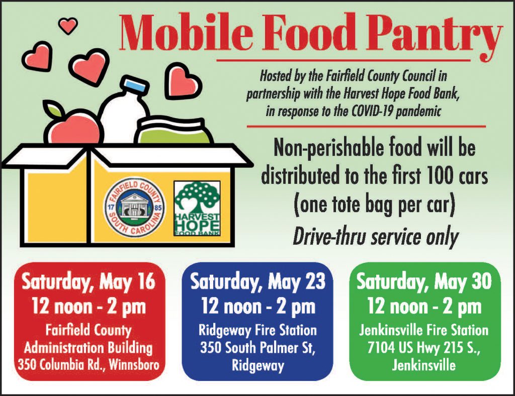 The food drives are hosted by the Fairfield County Council in partnership with Harvest Hope Food Bank, in response to the COVID-19 pademic. Non-perishable food will be distributed to the first 100 cars (one tote bag per car.) Drive-thru service only.