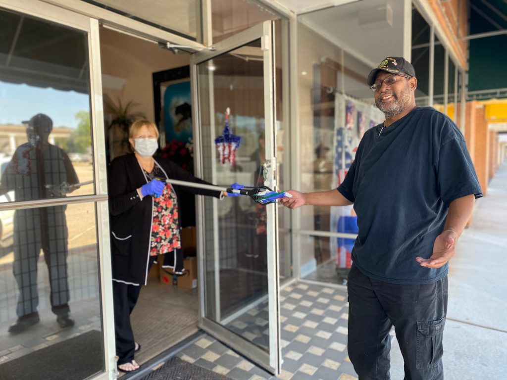 Owens placed an advertisement in The Voice, offering the masks and gloves to the public, free of charge. To receive them, residents rang the business doorbell and Owens, practicing social distancing, handed the mask/glove packets through the front door of her business with a long handled grabber.