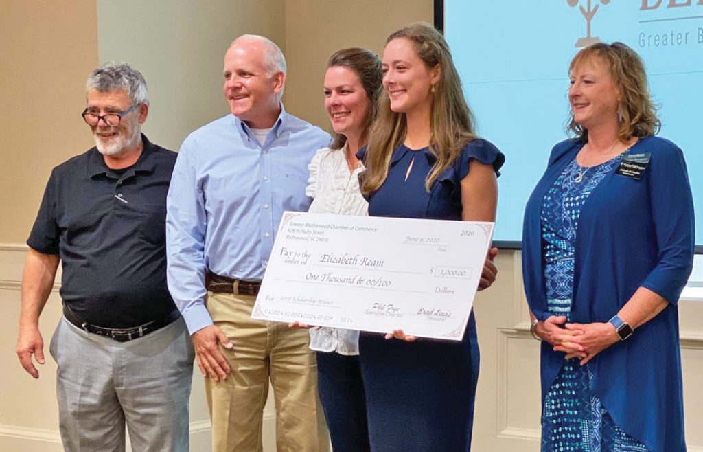 BLYTHEWOOD – The Blythewood Chamber awarded their annual $1,000 scholarship to Elizabeth Ream, shown here with Chamber Director Phil Frye, left, Elizabeth’s parents Robert Donchess and Danielle Ream, and the Chamber’s scholarship chairman, Deborah McCutchan. The scholarship was presented Tuesday at the regular monthly Chamber meeting.