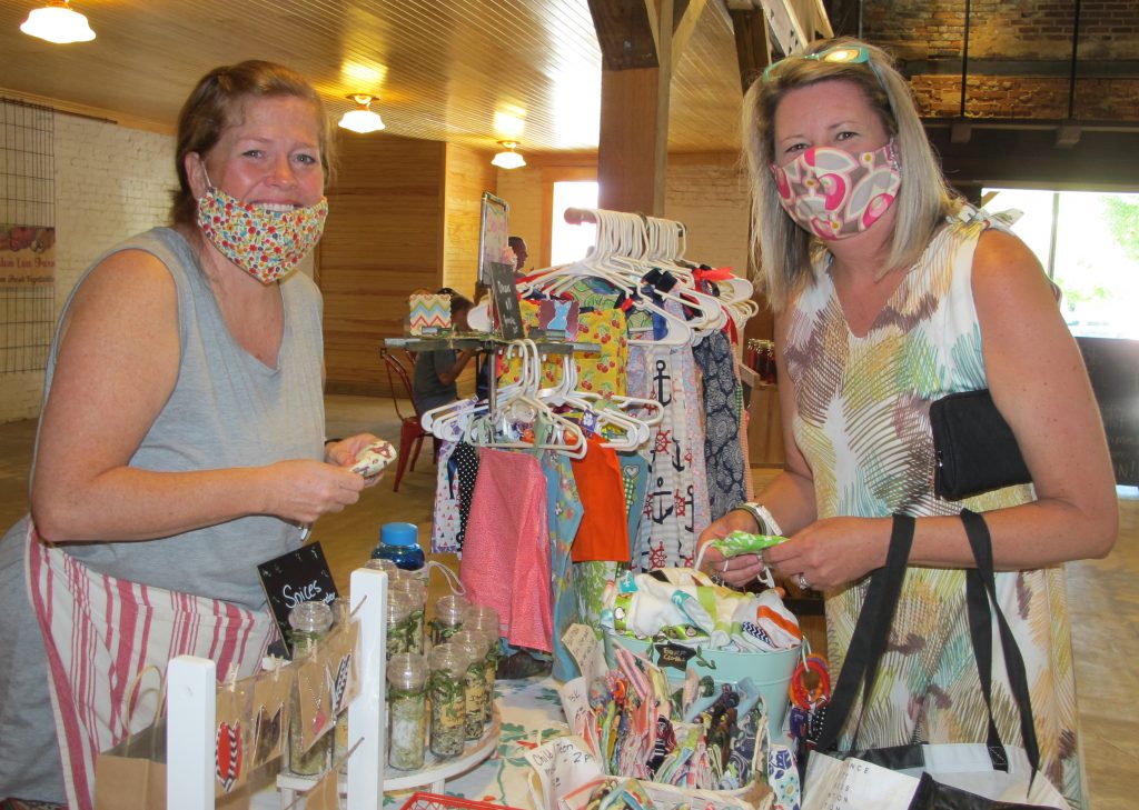WINNSBORO – Kay Hensley, right, found a large selection of handsewn adult and children’s face masks – with filter pockets and without – at Michelle Taylor’s booth during Saturday’s downtown Farmers Market. Profits from Taylor’s booth benefit Young Lives, a club that mentors and supports teenage moms.