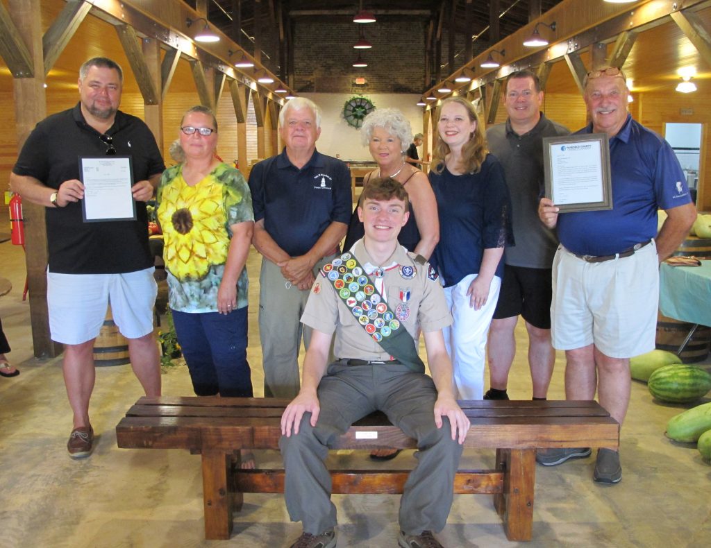 WINNSBORO – Winnsboro Eagle Scout Benjamin Truitt, 17, donated four oak benches, including the one he is sitting on, and a display table to the Fairfield County Market building during a short ceremony Saturday morning during the Farmers Market. Truitt, a rising senior at York Preparatory School, handcrafted the furniture as his Eagle Scout 2020 project.