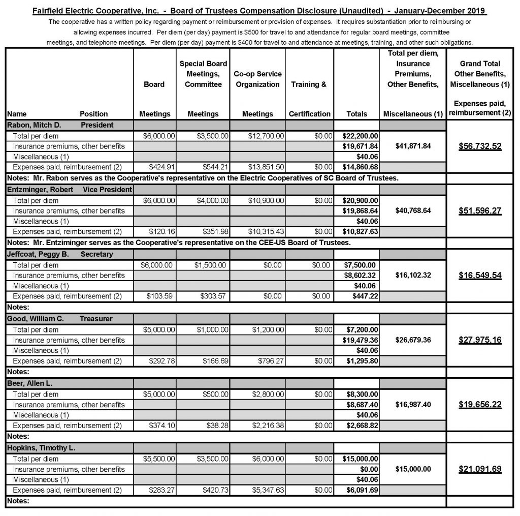 The Fairfield co-op’s per diem is $500 per meeting – usually held at Fairfield Electric’s Blythewood office – and they receive free health, dental and life insurance.