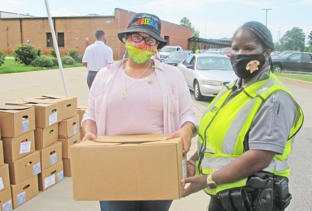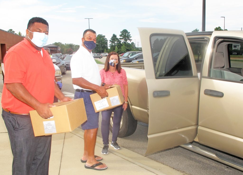 WINNSBORO – Fairfield County Council Chairman Neil Robinson, Councilman Clarence Gilbert and Clerk to Council Patti Davis help to distribute food boxes of fresh fruit and vegetables to Fairfield residents during the county’s sixth free food distribution last week at Fairfield Middle School.