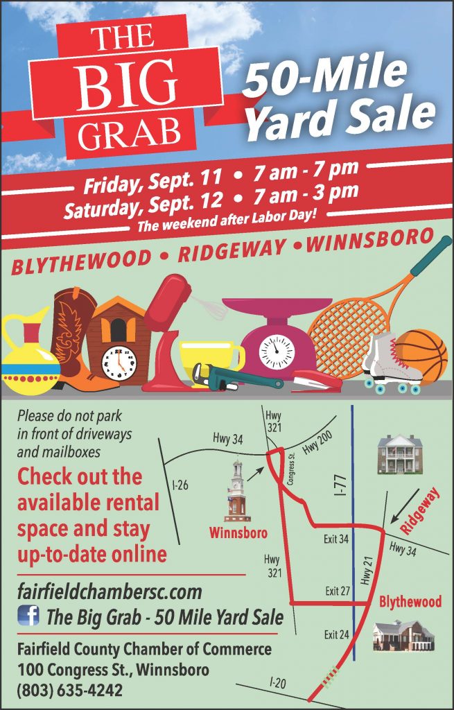 BLYTHEWOOD/FAIRFIELD – The Big Grab is here. The annual curbside crawl of yard sales, known as The Big Grab, will happen this Friday, Sept. 11, from 7 a.m. – 7 p.m. and Saturday, Sept. 12, from 7 a.m. – 3 p.m. It will encompass a 50-mile community network that includes Blythewood, Ridgeway and Winnsboro.
