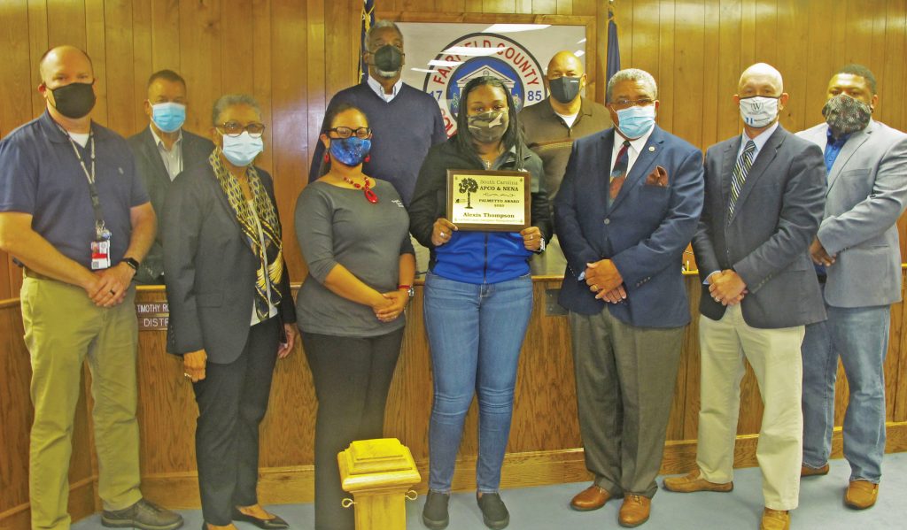 WINNSBORO – Alexis Thompson, a telecommunicator with Fairfield County Emergency Management/911, thought she had been invited to Monday night’s county council meeting to answer questions about her department’s budget. When she entered the council chambers, however, her supervisor, Brad Douglas, Director of the county’s Emergency Management, awarded Alexis the S. C. Palmetto Award for her professionalism in the use of Medical Dispatch software.