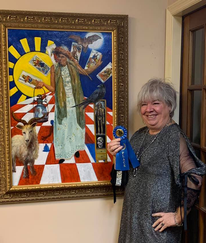 Barbara Yongue shows off her painting that won first place during her art show during the evening.