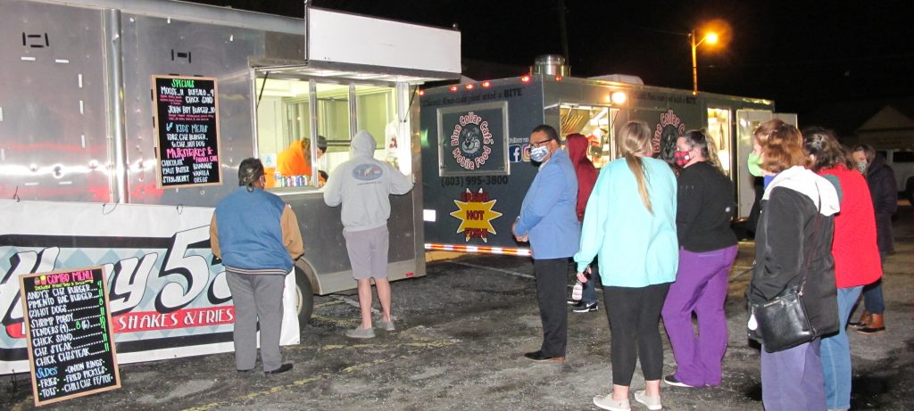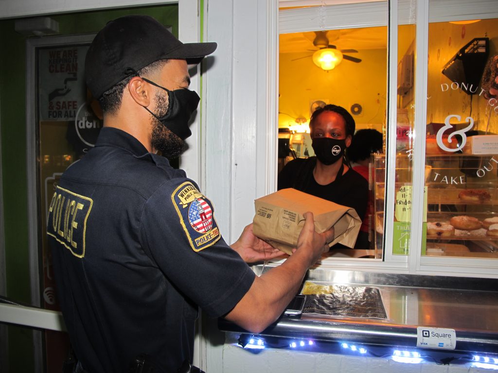 WDPS officer Jordan Walls stopped by The Donut Guy to pick up some wings and fries from owner Crystal Pauling.