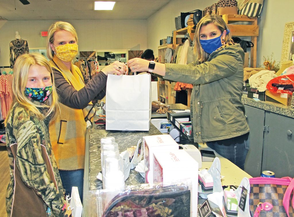 To Be Stitched owner Jerrica Beam hands a bag of purchases to Julie Price and her daughter Georgia Kate.