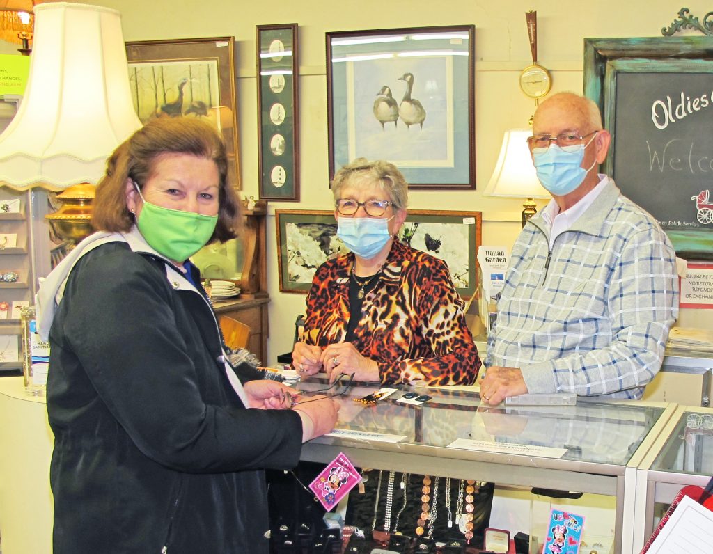 Shopper Linda Haslett pays for her purchase at Barbara and Robert Pemberton’s Oldies & Goodies consignment/antique shop.